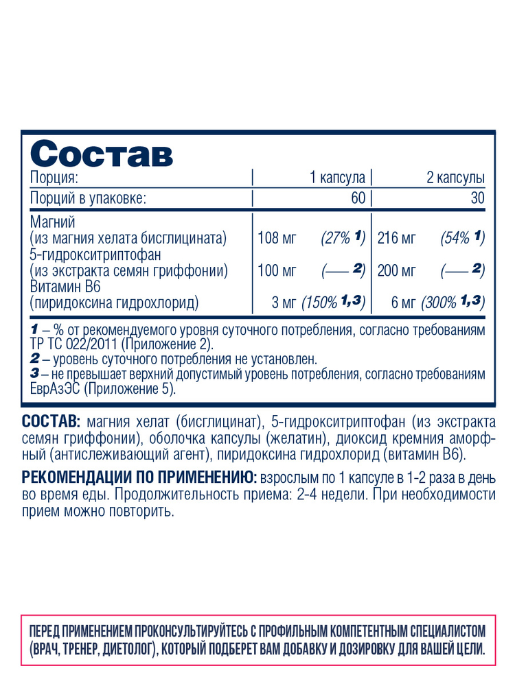 Состав: магния хелат (бисглицинат), 5-гидрокситриптофан (из экстракта семян гриффонии), оболочка капсулы (желатин), диоксид кремния аморфный (антислеживающий агент), пиридоксина гидрохлорид (витамин B6).