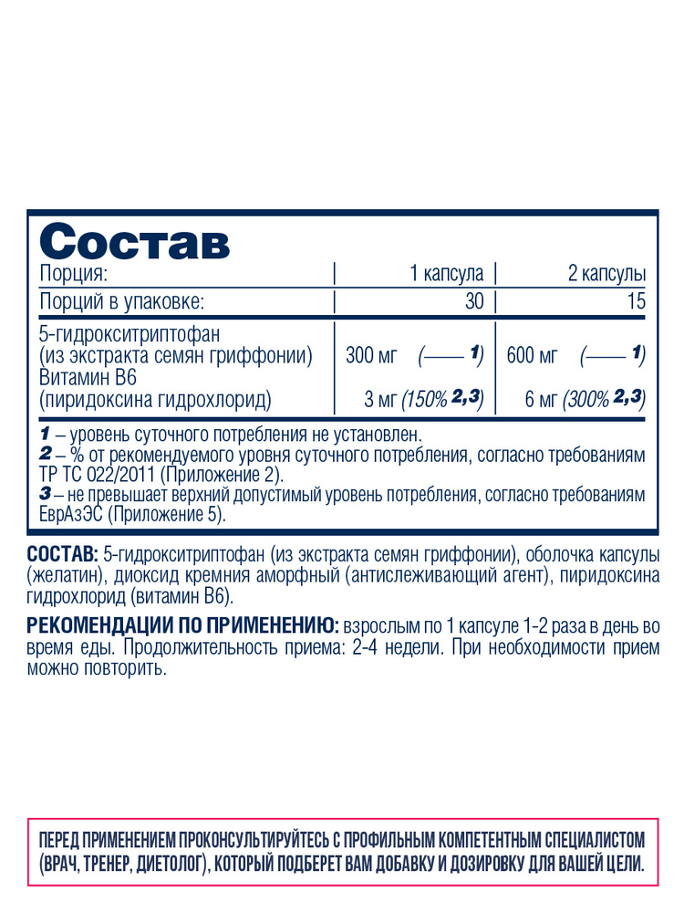 Состав: 5-гидрокситриптофан (из экстракта семян гриффонии), оболочка капсулы (желатин), диоксид кремния аморфный (антислеживающий агент), пиридоксина гидрохлорид (витамин B6).