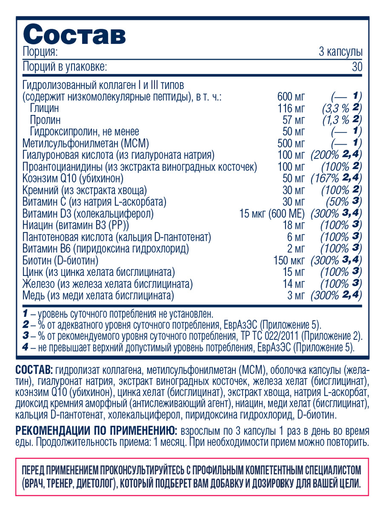 Состав: гидролизат коллагена, метилсульфонилметан (МСМ), оболочка капсулы (желатин), гиалуронат натрия, экстракт виноградных косточек, железа хелат (бисглицинат), коэнзим Q10 (убихинон), цинка хелат (бисглицинат), экстракт хвоща, натрия L-аскорбат, диоксид кремния аморфный (антислеживающий агент), ниацин, меди хелат (бисглицинат), кальция D-пантотенат, холекальциферол, пиридоксина гидрохлорид, D-биотин.