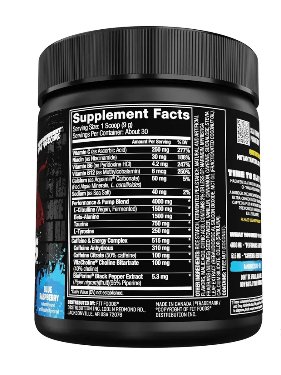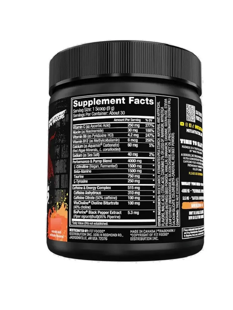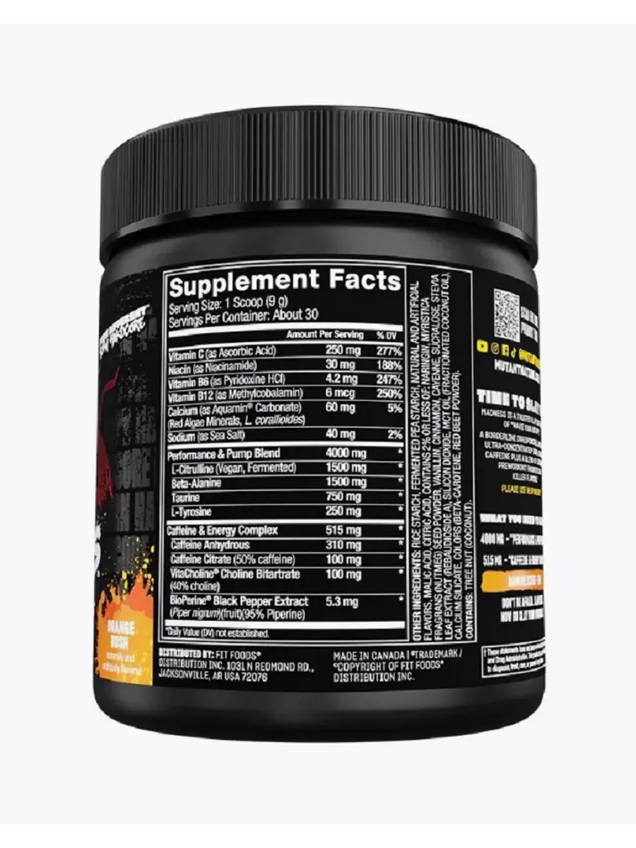 В состав Mutant Madness PVL входят такие активные компоненты: креатин ( для восстановления молекулы АДФ до АТФ и повышения выносливости), бета-аланин (улучшает мышечную сократимость), цитруллин, аргинин, теанин, экстракт зеленого чая и зеленого кофе.