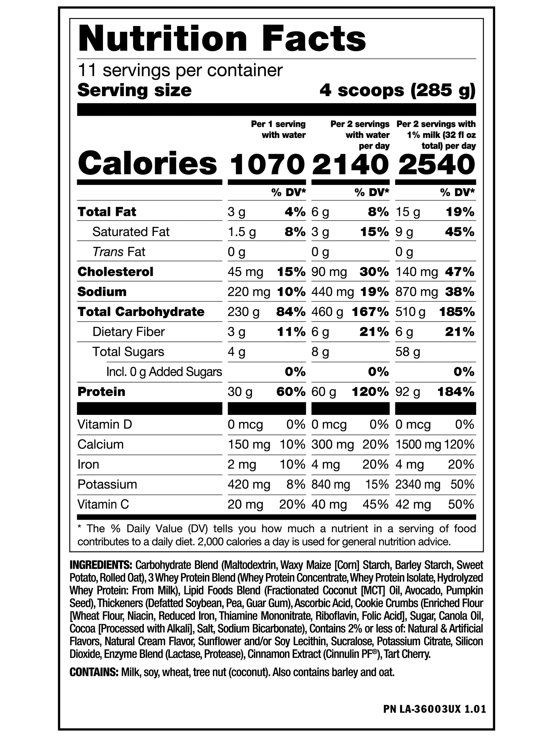 - 46 граммов 100% чистого сывороточного протеина, 255 граммов углеводов, 7,5 граммов полезных жиров на порцию (4 мерные ложки), смешанных в соответствии с указаниями.
