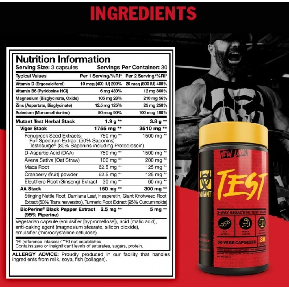 - Mutant TEST Herbal Stack — 1900 мг. Включает экстракты, направленные на поддержку тестостерона и гормонального равновесия.