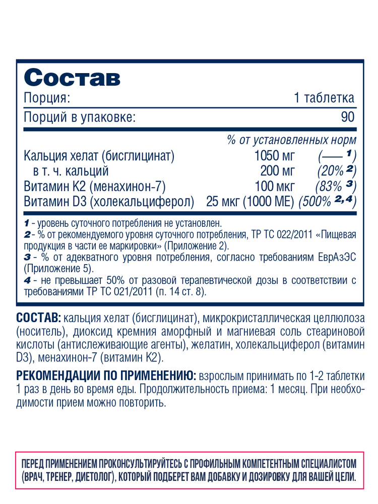 Состав: кальция аминокислотный хелат (бисглицинат), микрокристаллическая целлюлоза (носитель), холекальциферол, стеарат магния (агент антислеживающий), желатин, аэросил (агент антислеживающий), менахинон-7.