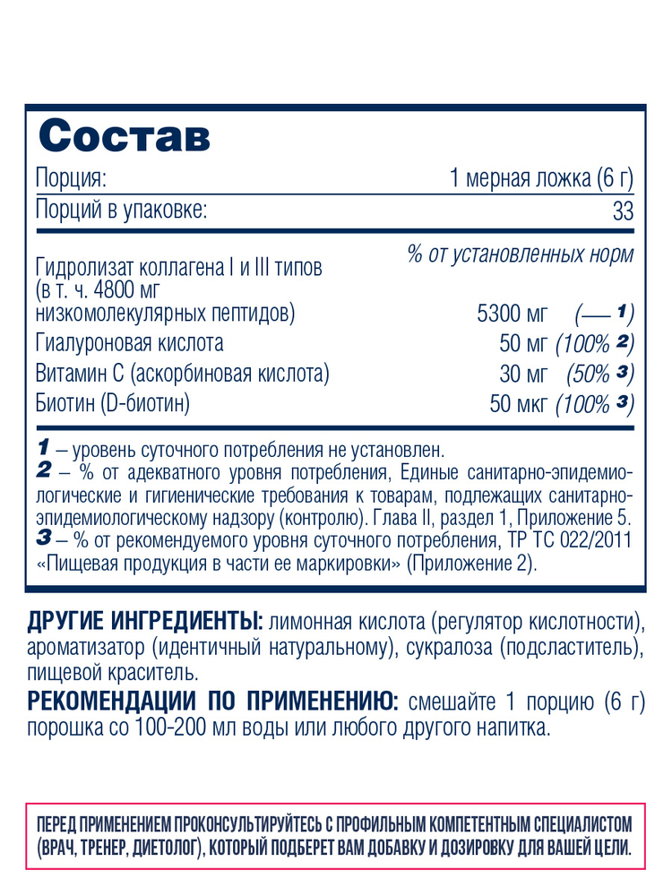 Основу добавки составляет гидролизованный коллаген. Это натуральный белок животного происхождения, прошедший специальную обработку для более легкого усвоения в пищеварительном тракте. Он быстро усваивается, насыщая организм полезными аминокислотами. Это специфический белок, состав которого отличается от белков, предназначенных для наращивания мышечной массы, но который увеличивает синтез собственного коллагена, входящего в состав связочного аппарата, кожи, хрящей, стенок сосудов и других органов.