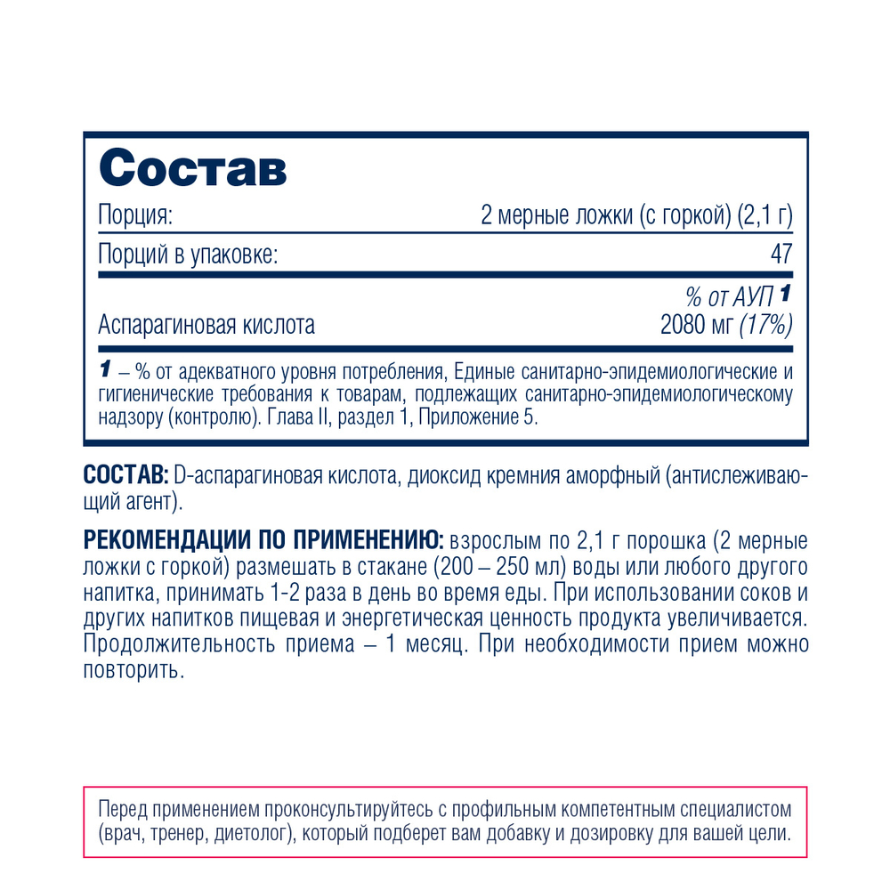 Состав: D-аспарагиновая кислота, диоксид кремния аморфный (антислеживающий агент).
