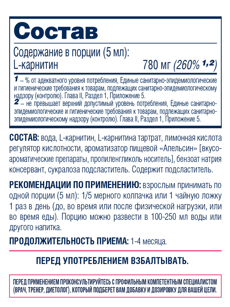 Состав: L-карнитин база, L-карнитин тартрат, лимонная кислота (регулятор кислотности), ароматизатор (идентичный натуральному), бензоат натрия, подсластитель сукралоза.