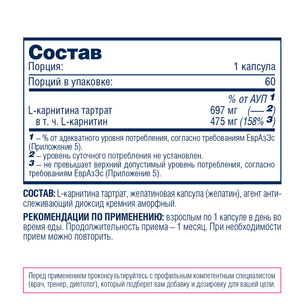 Состав: L-карнитин тартрат, желатиновая капсула (желатин), агент антислеживающий диоксид кремния аморфный.