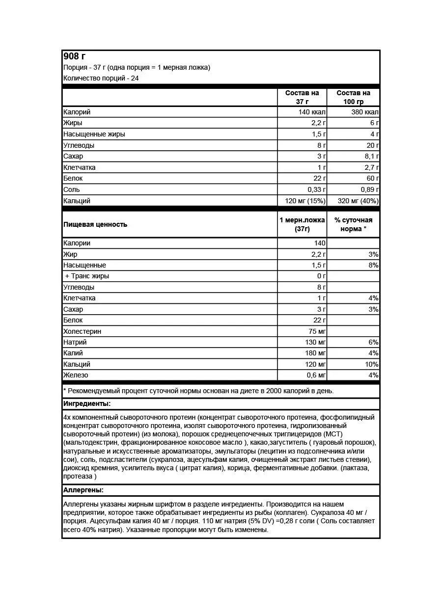 Ингредиенты: концентрат сывороточного протеина, изолят сывороточного протеина, инулин, ксантановая камедь, пептиды глутамина, натуральные и искусственные ароматизаторы, цитрат калия, ацесульфам калия, сукралоза, соевый лецитин.
